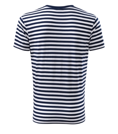 Streifen in weiß und marineblau, Schnitt mit Seitennähten, schmal geformter Kragensaum aus 1:1 Rippstrick mit 5 % Elastanzugabe, Innenseite des Kragens durch ein Band in T-Shirt Material versäubert, Schulternähte verstärkt mit einem Band