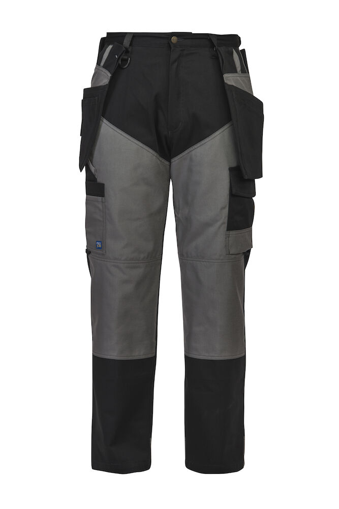 Zwei abnehmbare Hängetaschen mit Cordura® Verstärkung. Cordura® Verstärkung in grau vorne und hinten zum Schutz gegen Verschleiss von Oberschenkel- und Gesässpartie. Verlängerte Rückenpartie für besseren Komfort und Schutz. Aufgesetzte Gesässtaschen. Beintasche für Mobiltelefon und Taschen für Schreibgeräte und Werkzeug. Ein D-Ring. Zollstock-Tasche mit Taschen für Werkzeuge und Schreibgeräte sowie einem Knopf. Verstärkte und vorgeformte Kniepartie aus Cordura®, Öffnungen auf der Innenseite des Hosenbeins für Knieprotektoren. Hinteres Beinende mit Cordura® verstärkt. Gesäss- und Beintaschen mit Schlaufen vorbereitet für Inbags.