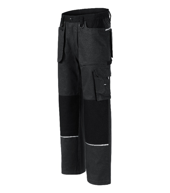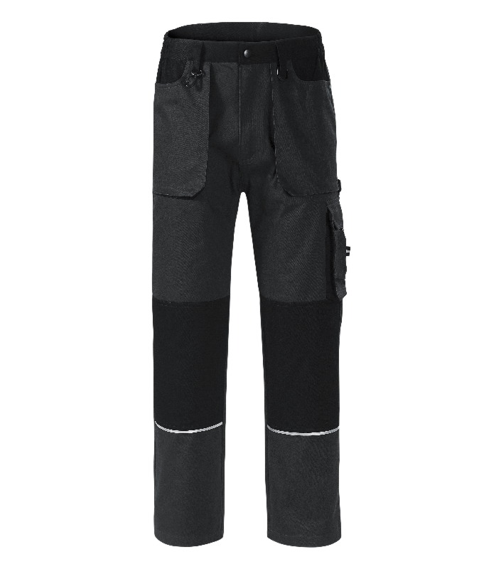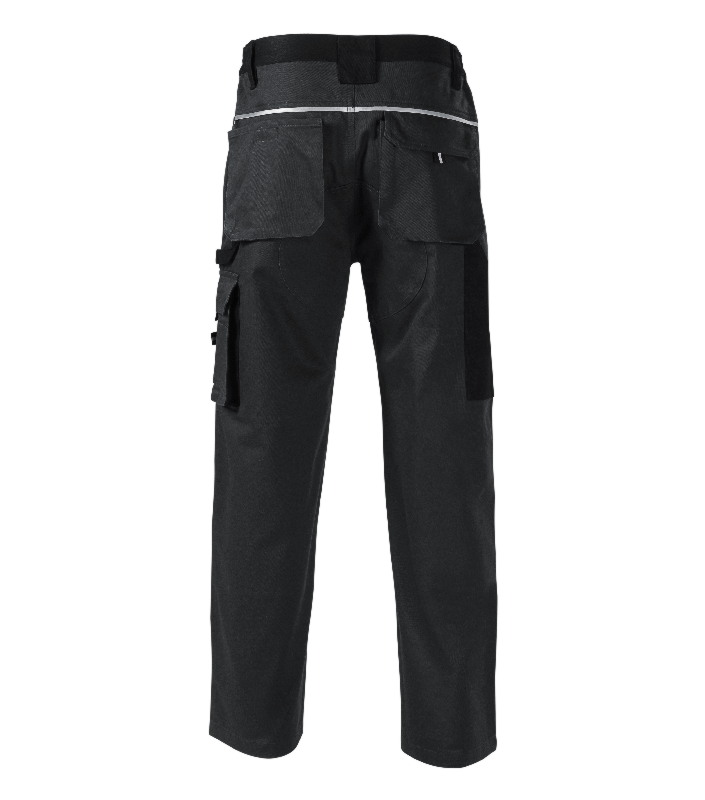 elastisches Band in Seitenteilen des Taillenkragens, 7 multifunktionale Taschen, Doppelmaterial im Bereich Knie und Gesäß, plastische "D" Schlaufe und ein Karabiner für Schlüssel und ID Karten, Schlaufe für Hammer, Doppelnaht für mehr Haltbarkeit, retroreflektierende Elemente